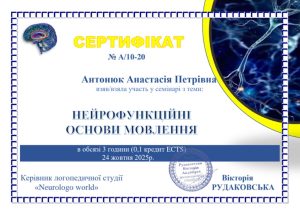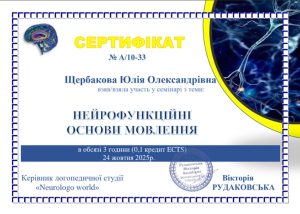 Зарахування Юлії ЩЕРБАКОВОЇ − здобувачки першого (бакалаврського) рівня вищої освіти, групи SoL1 – B24 (сертифікат А/10-33) та Анастасії АНТОНЮК − здобувачки другого (магістерського) рівня вищої освіти, групи SoL1 – М25 (сертифікат А/10-20) результатів неформального навчання на підставі участі у семінарі «Нейрофункційні основи мовлення» (обсяг − 0,1 кредит ЄКТС, 3 год), проведений керівником логопедичної студії «Neurologo world» Вікторією РУДОКОВСЬКОЮ, м. Кам’янець-Подільський: https://logo.kpnu.edu.ua/novyny/neurologo/ (відповідно договору №13/25 від 22.09.2025р. «Про виконання науково-дослідної роботи»: https://surl.li/immrsf).